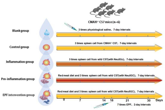 A Neu5Gc-mediated animal inflammatory model and an EPF intervention comparative model were established using CMAH−/− C57/BL6 mice as experimental subjects. The blank group was administered intraperitoneal injections of physiological saline, while the experimental control group received intraperitoneal injections of spleen cells from CMAH−/− C57/BL6 mice lacking Neu5Gc. The inflammation group was treated with intraperitoneal injections of wild-type C57/BL6 mice spleen cells containing Neu5Gc. The inflammation-promoting (pro-inflammation) group was fed a diet rich in red meat containing Neu5Gc based on the inflammation group. In the pre-experiment, the maximum daily intake of mice was tested, and red meat was cooked and fed to the mice. Finally, the EPF intervention group received injections of EPF protein following the inflammation-promoting regimen. In our preliminary experiment, we fed red meat and injected CMAH−/− mice with cells without Neu5Gc. The experimental results showed no difference compared to the blank group. Therefore, in order to retain the single variable of the control group and the Inflammation group, which is the injection of spleen cells with/without Neu5Gc, we chose to simplify the control group by not feeding red meat and injecting spleen cells without Neu5Gc.