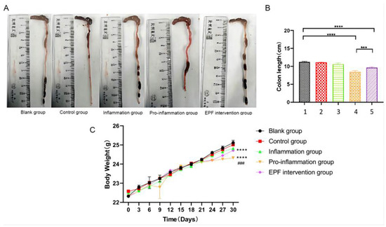After conducting the experiment, we proceeded with the euthanasia and dissection of the mice to meticulously observe and document alterations in both colon length and fluctuations in body weight. The changes observed in colon length can serve as an indirect indicator of pathological modifications and inflammation levels within the colon tissue of the mice, often accompanied by corresponding variations in body weight. As depicted in Figure 2A,B, when compared to the blank group (approximately 11 cm), there was a significant reduction in colon length among mice subjected to the pro-inflammation group (around 9 cm), indicating evident damage to their colon tissue. However, the administration of EPF via intraperitoneal injection resulted in the restoration of colon length (about 10 cm) among the EPF intervention group mice, thereby ameliorating the condition characterized by shortened colons with statistically significant differences (p < 0.001). These findings strongly suggest that EPF possesses potential therapeutic properties capable of alleviating shortened colons associated with inflammation.