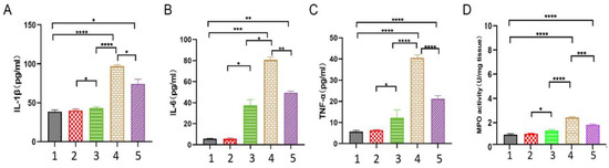 The administration of EPF resulted in a reduction in the levels of inflammatory factors in the serum of mice with inflammation. After blood collection, the serum was separated, and the levels of inflammatory factors in the serum were analyzed. (A): the levels of IL-1β; (B): the levels of IL-6; (C): the levels of TNF-α. (D): MPO activity in tissues. 1. Blank group 2. Control group 3. Inflammation group 4. Pro-inflammation group 5. EPF intervention group. The data are presented as mean ± SD and analyzed using one-way analysis of variance. Significance levels were indicated as * p < 0.05, ** p < 0.01, *** p < 0.001 and **** p < 0.0001 compared to each respective group.