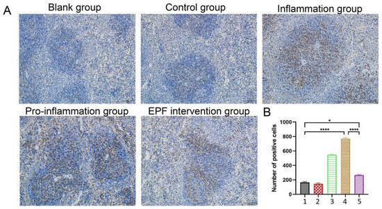 After undergoing EPF treatment, the CD4 cell count in Neu5Gc-induced inflammatory mice exhibited a significant decrease. After euthanizing the mice, the intact spleens were delicately excised and meticulously rinsed with distilled water. Subsequently, the CD4 cell population within the spleens was assessed via immunohistochemistry. (A): effect of EPF on the CD4 cell content in the spleen of mice with Neu5Gc-induced inflammation. (B): alterations in CD4 cell numbers in the spleen of mice with Neu5Gc-induced inflammation. 1. Blank group 2. Control group 3. Inflammation group 4. Pro-inflammation group 5. EPF intervention group. The data are presented as mean ± SD, and statistical analysis was performed using one-way analysis of variance (ANOVA). Significance levels were indicated as * p < 0.05 and **** p < 0.0001 compared to each respective group.