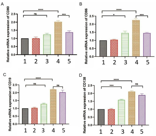 The expression of key molecules involved in B cell activation was downregulated by EPF in Neu5GC-induced inflammatory mice. We assessed the transcriptional levels of CD19, CD80, CD86, and CD138, which are crucial for B cell activation in inflammatory mice, following EPF intervention using fluorescent quantitative PCR. (A). Transcriptional status of CD80 mRNA molecule. (B). Transcriptional status of CD86 mRNA molecule. (C). Transcriptional status of CD19 mRNA molecule. (D). Transcriptional status of D138 mRNA molecule. The experimental groups included: 1. Blank group 2. Control group 3. Inflammation group 4. Pro-inflammation group 5. EPF intervention group. The data are presented as mean ± SD, and statistical analysis was performed using one-way analysis of variance (* p < 0.05, *** p < 0.001 and **** p < 0.0001 indicate significance compared to each group). “ns” denotes no significance.