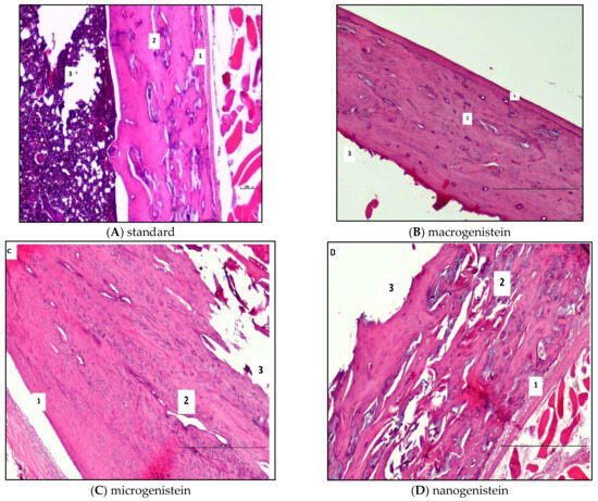 Results of the histopathological analysis of rat femurs in conditions of neoplasia in relation to supplementation (macro-, micro-, or nanogenistein) (1—compact layer; 2—plexiform bone; 3—medullary cavity) (haematoxylin & eosin staining, 20× magnification).