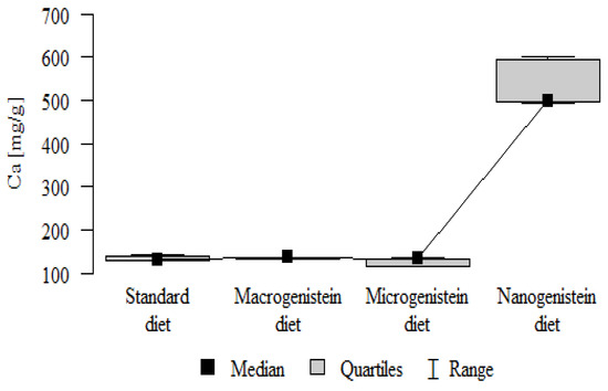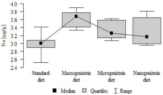 - Content of Ba in the bones was significantly higher in the group supplemented with macrogenistein than in the groups receiving micro- and nanogenistein and the standard diet. The Ba level was significantly higher in the microgenistein group than in the group on the standard diet (Table 3; Figure 13).