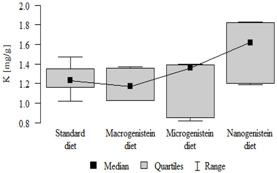 Figure 4. Potassium in the femurs of rats supplemented with various forms of genistein: macrogenistein; microgenistein; nanogenistein; no supplementation (standard diet). - −