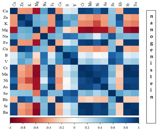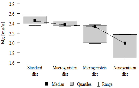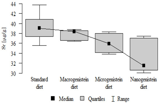 - Content of Mg and Sr in the bone tissue was significantly higher in the rats without supplementation (standard diet) than in the groups receiving micro- and nanogenistein. The levels of these elements were significantly higher in the bones of rats supplemented with macrogenistein compared to the group supplemented with nanogenistein (Table 3; Figure 5 and Figure 6).