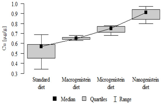 Figure 7. Copper in the femurs of rats supplemented with various forms of genistein: macrogenistein; microgenistein; nanogenistein; no supplementation (standard diet).