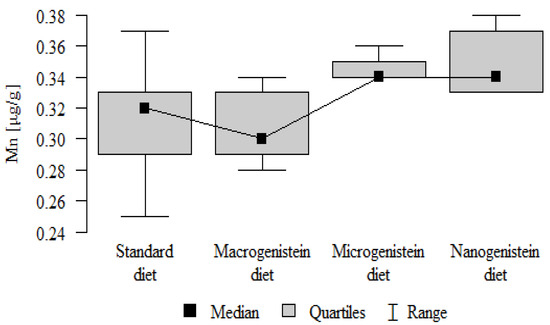 Figure 8. Manganese in the femurs of rats supplemented with various forms of genistein: macrogenistein; microgenistein; nanogenistein; no supplementation (standard diet). - −