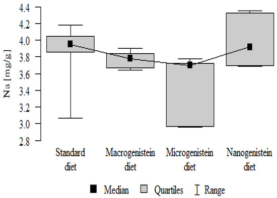 - Content of Na in the bone tissue was significantly higher in rats on the standard diet and the diet supplemented with nanogenistein than in the bones of rats receiving microgenistein (Table 3; Figure 9).