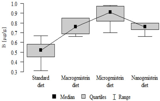 | B [μg/g] | Standard diet | 0.51 | 0.12 | 0.52 | 0.31 | 0.67 | 0.45 | 0.58 | p < 0.001 * |