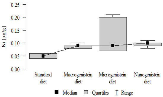 - Content of B and Ni in the bone tissue was significantly higher in rats supplemented with various forms of genistein than in those receiving the standard diet (Table 3; Figure 10 and Figure 11).