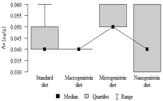 - Content of As in the bones was significantly higher in the group supplemented with microgenistein than in the remaining groups (Table 3; Figure 12).