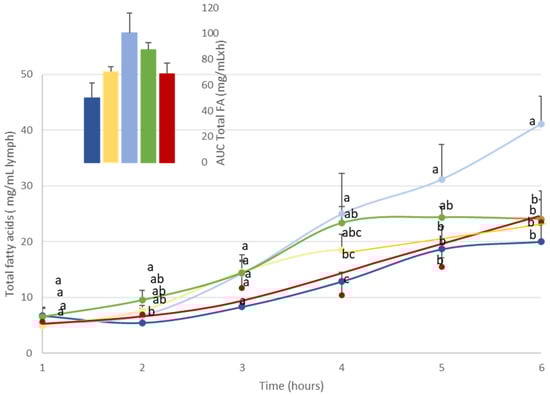 In qualitative terms (Figure 2A), DHA was gradually incorporated into lymph lipids, regardless of the formula used. At the end of the phase, DHA represented between 27 and 50% of total fatty acids, depending on the formula used. More precisely, the A-DHA PL blend and A-DHA EE groups had the lowest proportion of DHA (around 27% at T 6 h), while the A-DHA emulsion, A-DHA TG, and A-DHA MG groups presented the highest DHA proportions (43%, 45%, and 49% of total fatty acids, respectively).
