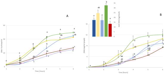 Kinetics of the intestinal absorption of DHA, i.e., (A) % of total fatty acids, (B) mg/mL lymph, in rats subjected to a lymphatic duct fistula (n = 6 rats/group). Rats were provided a single bolus of various DHA-microalgal formulas (equivalent to 300 mg DHA/animal) where DHA was vectorized as triglyceride either in oil phase (A-DHA TG: