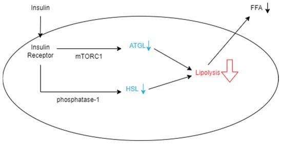 - Chakrabarti, P.; Kim, J.Y.; Singh, M.; Shin, Y.K.; Kim, J.; Kumbrink, J.; Wu, Y.; Lee, M.J.; Kirsch, K.H.; Fried, S.K.; et al. Insulin inhibits lipolysis in adipocytes via the evolutionarily conserved mTORC1-Egr1-ATGL-mediated pathway. Mol. Cell Biol. 2013, 33, 3659–3666. [Google Scholar] [CrossRef] [PubMed]