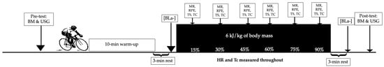 Schematic of the study design. BM, body mass; USG, urine specific gravity; [BLa-], blood lactate; min, minute; MR, mouth rinse; RPE, Ratings of Perceived Exertion; TS, thermal sensation; TC, thermal comfort; HR, heart rate; Tc, core temperature.