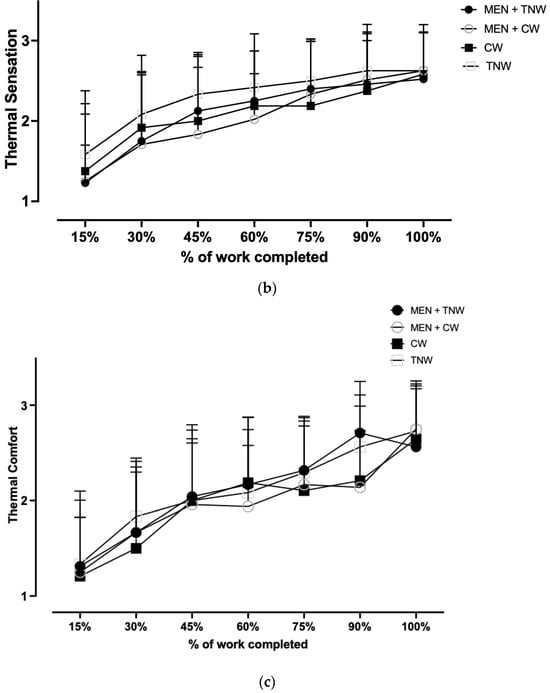 The effects of mouth rinsing (MR) on (a) Ratings of Perceived Exertion (RPE), (b) thermal sensation (TS), and (c) thermal comfort based on the percentage of the time trial completed (%) on cycling TT performance in thermoneutral conditions. Data are mean ± SD (n = 12). MR, mouth rinsing; RPE, rating of perceived exertion; TS, thermal sensation; TC, thermal comfort; MEN, menthol; TNW, thermoneutral water; CW, cold water. (p > 0.05).