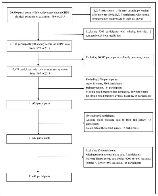 The current study design was a prospective cohort based on seven-round surveys of CHNS from 1997 to 2015. Inclusion was given to participants meeting all of the following criteria: (1) taking at least two rounds of the CHNS; (2) aged no less than 18 years old; (3) with dietary records and reasonable total energy intake; and (4) with blood pressure data. Participants were excluded if they met one or more of the following characteristics: (1) younger than 18 years or pregnant; (2) missing dietary or blood pressure data; (3) suffering from hypertension at baseline; or (4) with implausible energy intake (male: <600 or >4200 kcal/day; female: <500 or >3600 kcal/day). The flow chart is shown in Figure 1.