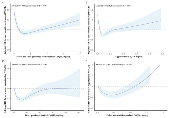 The relations of animal-food-derived CoQ10 and new-onset hypertension. Adjusted for age, sex, BMI, job, education level, region, smoking status, alcohol drinking status, baseline SBP, physical activity, abdominal obesity, total energy intake (kcal/day), and mutual adjustments for CoQ10 from other sources (mg/day). The dark blue curve represents the estimated value, and the light blue area represents 95% CIs. The gray dashed line represents the reference line with HR = 1. (A) meat- and their processed-food-derived CoQ10; (B) egg-derived CoQ10; (C) dairy-product-derived CoQ10; (D) fish- and shellfish-derived CoQ10.