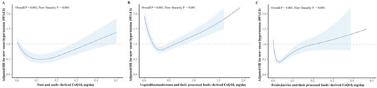 The relations of plant-food-derived CoQ10 and new-onset hypertension. Adjusted for age, sex, BMI, job, education level, region, smoking status, alcohol drinking status, baseline SBP, physical activity, abdominal obesity, total energy intake (kcal/day), and mutual adjustments for CoQ10 from other sources (mg/day). The dark blue curve represents the estimated value, and the light blue area represents 95% CIs. The gray dashed line represents the reference line with HR = 1. (A) nut- and seed-derived CoQ10; (B) vegetable- and their processed-food-derived CoQ10; (C) fruit- and their processed-food-derived CoQ10.