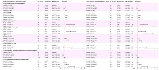 The forest plot of different food sources of CoQ10 and hypertension risk. The intake of consumers was categorized into quartiles or tertiles. The HRs and 95% CIs were shown as the black solid dots and black horizontal solid lines. The red vertical dashed lines represent the reference lines with HR = 1. On the right part of this figure, the intake was adjusted by total energy using the residual method. The symbol of * represents that the results were obtained based on energy-adjusted CoQ10 intake.