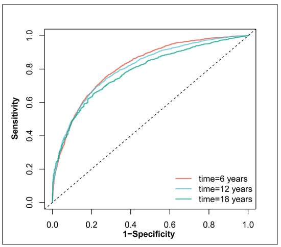 The ROC curves at different time points. The ROC curves are illustrated in red, blue and green for the time six years, twelve years and eighteen years, based on model 2 with a diversity score of CoQ10 source as one continuous variable. The dashed line represents the reference line, the area under which is 0.5. Abbreviations: ROC = receiver operating characteristic curve; AUC = area under the curve.