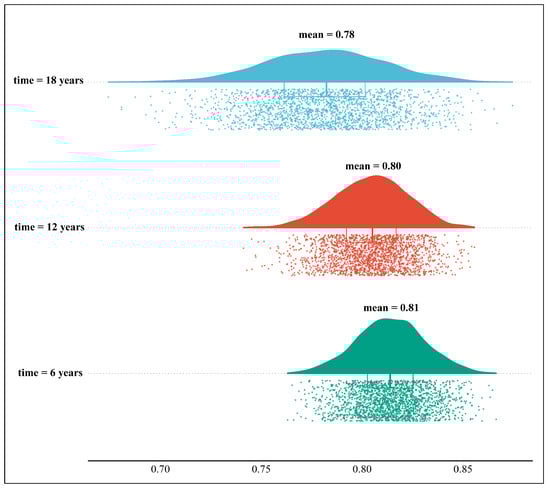 The visualization of 200-times 10-fold cross-validation of this cohort. At the time points of six years, twelve years and eighteen years, the cohort was internally validated via the method of ten-fold cross validation for 200 times. The distribution of 2000 values of AUC at each time point is shown in this figure.