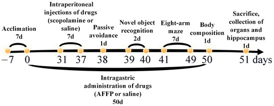 The methodology for conducting animal experiments is outlined in Figure 1. The animal experiments were based on the research methodologies employed by Zheng et al. [16], Wu et al. [23], and Zhao et al. [24]. A total of twenty-seven male C57BL/6 mice of SPF grade were randomly distributed into three groups named control (administered with saline), scopolamine (administered with saline and scopolamine), and AFFP+scopolamine (administered with AFFP and scopolamine), with nine mice in each group. The weight of all mice was recorded every 7 days. The mice were acclimatized to the laboratory environment by being fed for a period of 7 days after their transfer from the supplier’s premises to the laboratory animal house, prior to the commencement of the experiment. Following a 7-day period of acclimation, during which the mice were provided only with normal food and water and not administered any drugs, they were subsequently orally administered drugs for a period of 50 consecutive days. On the 0–50th day, mice in the control group and in the scopolamine group were administered with 0.9% saline at 40 mg/kg via gavage, and mice in the AFFP+scopolamine group were administered with Antarctic krill peptide AFFP at 40 mg/kg via gavage. Additionally, on the 31–37th day, each group of mice received daily intraperitoneal injections of drugs (scopolamine and saline) two hours after receiving drugs (AFFP and saline) through gavage. Here are the details: mice in the control group were administered with 0.9% saline at a dosage of 1 mg/kg via intraperitoneal injection two hours after receiving 0.9% saline at 40 mg/kg via gavage, mice in the scopolamine group were administered with scopolamine at a dosage of 1 mg/kg via intraperitoneal injection two hours after receiving 0.9% saline at 40 mg/kg via gavage, and mice in the AFFP+scopolamine group were administered with scopolamine at a dosage of 1 mg/kg via intraperitoneal injection two hours after receiving AFFP at 40 mg/kg via gavage. The saline and peptide concentrations administered via gavage were 4.2 mg/mL, with a gavage volume of 0.2 mL, resulting in a total dose of 0.84 mg per mouse. The saline and scopolamine were intraperitoneally injected at a concentration of 0.105 mg/mL in a volume of 0.2 mL, totaling 0.021 mg per mouse. Both peptides and scopolamine were dissolved evenly in pure water at 25 °C before administration. The volume of drugs such as saline, AFFP, and scopolamine was based on prior research [16]. On the 38–49th day, behavioral experiments such as the passive avoidance experiment, novel object recognition experiment, and eight-arm maze experiment were conducted sequentially. On the 50th day, the measurement of the mice included the proportion of lean mass, fat, and water content. On the 51st day, the mice were euthanized via cervical dislocation following the extraction of blood from their eyeballs. Their organs such as brain, lung, liver, heart, spleen, kidney, jejunum, and hippocampus were collected and preserved for immediate experiments by being placed on ice, frozen in liquid nitrogen, and stored at −80 °C.