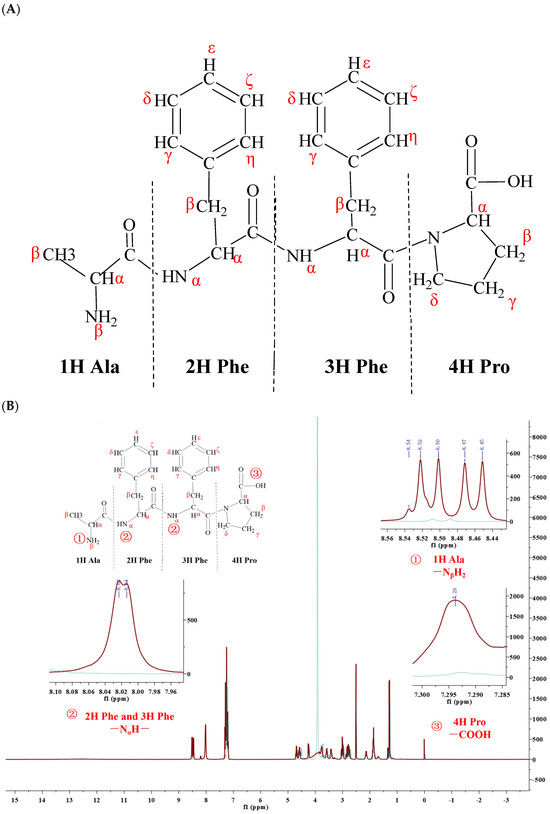 The potential bioactivity of the AFFP was ascertained by 1H NMR spectroscopy in terms of its ability to provide hydrogen protons. In organic chemistry, the carbon atom that was directly bonded to the functional group within a molecule was referred to as the α-carbon atom, while the hydrogen atom attached to this α-carbon was known as the α-hydrogen. Subsequent carbon atoms or hydrogen atoms were designated as β, γ, and so forth in a sequential manner. The graphical representation of the hydrogen protons within the AFFP is depicted in Figure 2A. The active hydrogen sites of the AFFP were identified by analyzing the differences in chemical shifts in the 1H NMR spectra before and after the addition of D2O. This is illustrated in Figure 2B. The active hydrogen sites of AFFP were found to be located at a chemical shift of 8.45–8.54 ppm, 8.01–8.02 ppm, and 7.29 ppm. The shift of 8.45–8.54 ppm was potentially indicative of the H protons on the -NβH2 group in 1H Ala, and the chemical shift of 8.01–8.02 ppm was observed for the H proton on the -NαH- group in 2H Phe and 3H Phe [40,41,42,43,44]. The chemical shift of 7.29 ppm was the H proton on the -COOH group of the 4H Pro [17]. It implied that AFFP potentially exhibited biological properties, such as antioxidant activity, owing to its spatial configuration, which offered the increased binding possibilities with free radicals attributed to the greater abundance of active hydrogen sites in its side chain.