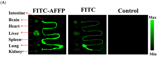 Another nine male C57BL/6 mice of SPF grade were randomly distributed into three groups named Control, FITC, and Fluorescein Isothiocyanate Labelled AFFP (FITC-AFFP), with three mice in each group. Prior to the experiment, the mice underwent a twelve-hour fasting period with unrestricted access to water. The FITC and FITC-AFFP+scopolamine groups were orally administered 10 mg/kg of FITC and FITC-AFFP, respectively, while the control group received 0.9% saline via gavage. Following a two-hour period of digestion, Mice were euthanized via cervical dislocation, and the brain, lung, liver, heart, spleen, kidney, and intestine were collected for the fluorescence imaging experiment.