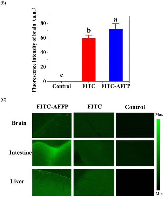 Absorption distribution of AFFP in vivo. (A) Fluorescence imaging of intestine, brain, heart, liver, spleen, lung, and kidney of mice by MIIS XFP-BIX fluorescence imager. (B) Fluorescence intensity in brain of mice. The different letters represent significant differences (p < 0.05). (C) Fluorescence imaging of brain, liver, and intestine of mice by ECHO Revolve microscope.