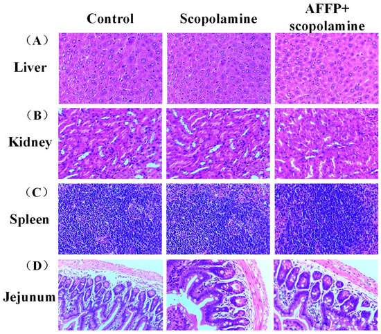 According to Table 1, the mice’s body weight exhibited a gradual increase over time, with no notable variation observed among the various groups (p > 0.05). According to the statistical findings, there were no notable variances in the proportions of lean meat, fat, and water in mice across the various groups (p > 0.05). At the same time, there were no notable variations observed in the organ sizes of the heart, liver, spleen, lung, kidney, brain, and hippocampus among the various groups (p > 0.05). No significant morphological alterations were observed in liver, spleen, kidney, and jejunum, as depicted in Figure 4A–D based on H&E staining. This was similar to the findings of Zheng et al. [16]. No notable variances in weight, composition, and organ ratios were observed among the various mouse groups following the administration of shrimp peptide via gavage [16]. The findings indicated that AFFP could be developed as a potential functional component without damage to organs of the body.