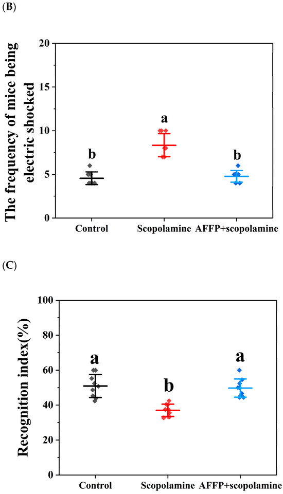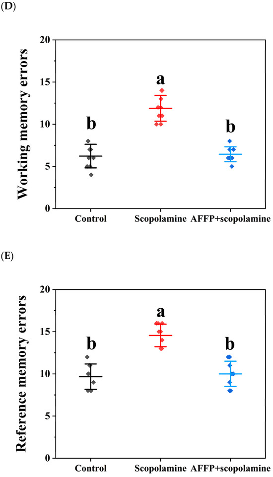 Passive avoidance experiments, novel object recognition experiments, and eight-arm maze experiments are often used to assess the spatial learning and memory abilities of mice. During the passive avoidance tests (Figure 5B), the frequency of mice receiving an electric shock in the scopolamine group showed a significant increase compared to the control group (p < 0.05). Conversely, the AFFP+scopolamine group exhibited a significantly reduced avoidance in comparison to the scopolamine group (p < 0.05). According to Figure 5C, the mice in the scopolamine group had a noticeably reduced recognition index compared to the control group (p < 0.05). However, the mice in the AFFP+scopolamine group exhibited a notably higher recognition index than the scopolamine group (p < 0.05) during the novel object recognition experiments. Additionally, it was observed in Figure 5D,E that the scopolamine group showed a notable reduction in both working memory errors and reference memory errors compared to the control group (p < 0.05). Conversely, the AFFP+scopolamine group exhibited a notable rise in these errors in comparison to the scopolamine group (p < 0.05). Current studies [7] have shown a positive correlation between the shocked time in passive avoidance experiments and the severity of their memory disorders. Zhao et al. [24] discovered that mice given varying amounts of FYDWPK, ranging from low to high doses, exhibited enhanced memory performance in the passive avoidance test compared to the control group. A higher recognition index signified a heightened capacity for recognizing and remembering novel objects, while a lower recognition index indicated a diminished ability in this regard [49]. Our results were in line with the literature, in which SKF38393 HCl induced a long-term recognition memory enhancement by observing a higher value of discrimination index [50]. A higher level of learning and memory ability was suggested by the decreasing levels of working memory errors and reference memory errors [51]. The administration of 4′-hydroxyl-2-subsitiuted phenylnitronyl nitroxide (HPN) was discovered to have a significant and alleviating effect on the histological damages and spatial memory loss caused by hypobaric hypoxia (HH). This was supported by the reduced working memory errors and reference memory errors [52]. Overall, three types of behavioral tests conducted on mice indicated that AFFP alleviated the spatial differentiation and memory decline caused by scopolamine.