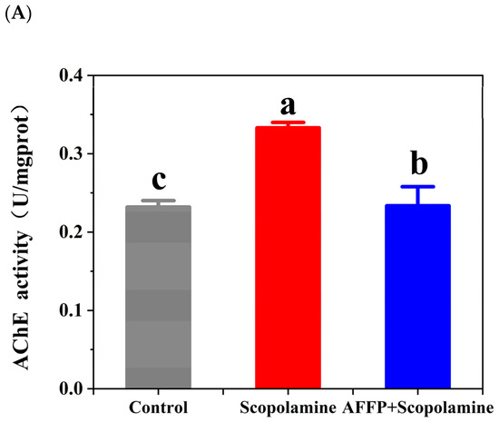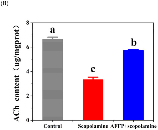 Effect of AFFP on the AChE activity and ACh content in the hippocampus of scopolamine-induced mice. (A) AChE activity. (B) ACh content. The different letters represent significant differences (p < 0.05).