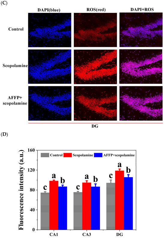 Effect of AFFP on scopolamine-induced oxidative stress. (A) Representative images of fluorescence staining in the CA1 region of the hippocampus. (B) Representative images of fluorescence staining in the CA3 region of the hippocampus. (C) Representative images of fluorescence staining in the DG region of the hippocampus. (D) ROS fluorescence intensity in the CA1, CA3, and DG regions of the hippocampus. (E) SOD activity in serum. (F) MDA levels in serum. The different letters represent significant differences (p < 0.05).