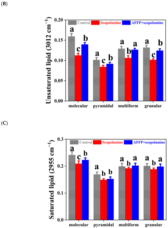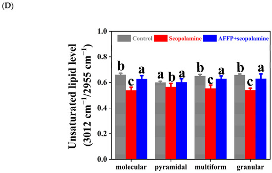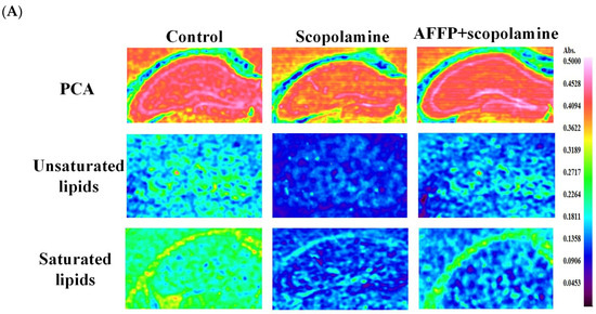 The unsaturated lipid levers in the brain have a strong correlation with memory and neurological disorders, and they play a crucial part in the formation of the nervous system while also providing neuroprotective benefits for those experiencing memory impairment or the natural process of aging [62]. For a long time, it has been believed that polyunsaturated lipids were advantageous for cognitive function and memory. These lipids are recognized as regulators of neurotransmission and synaptic plasticity [63]. The levels of polyunsaturated lipids and saturated lipids impacted the cognitive function and memory retention of grown-up progeny [64]. Excessive ROS in the hippocampus would attack unsaturated lipid in biofilms and form lipid peroxides, triggering apoptosis and functional disorders of neurological systems [65]. Chwiej examined the dispersion of unsaturated lipid levels in the hippocampus by utilizing Fourier Transform Infrared (FTIR) microscopy. The absorption peaks at 2955 cm−1 (CH3 from lipids) and 3012 cm−1 (CH2 from lipids) were identified as the distinctive absorption signals for assessing the levels of saturated and unsaturated lipids [66,67]. According to the variances in cell composition [39], the hippocampus was categorized into four primary layers, namely, molecular, multiform, pyramidal, and granular layers. The study found that the hippocampus in the scopolamine group had significantly lower levels of unsaturated lipids and a lower percentage of relative saturated lipids compared to the control group. Conversely, the AFFP+scopolamine group exhibited notably elevated amounts and proportion of unsaturated lipids in comparison to the scopolamine group (p < 0.05) (Figure 8A–D). These findings aligned with the results reported by Lu et al. [7]. Sea Cucumber Peptides had the potential to mitigate the decrease in unsaturated lipid contents and unsaturated lipid ratio in the hippocampus of scopolamine-induced mice. SCP increased polyunsaturated fatty acid levels, including linolenic acid, arachidonic acid, docosahexaenoic acid, and decreased saturated fatty acid levels, including palmitic acid and stearic acid. Yu et al. [64] documented that elevated levels of saturated fats, like palmitic acid, and reduced levels of polyunsaturated fats, particularly docosahexaenoic acid and arachidonic acid, in the brains of C57BL/6j mice resulted in impaired spatial memory and learning capabilities. Ueda et al. [68] found that mice provided with a diet rich in polyunsaturated lipids exhibited increased levels of polyunsaturated lipids in their brains, improved memory, and enhanced lifespan. Eicosapentaenoic acid and docosahexaenoic acid from unsaturated lipids have been found to influence synaptic transmission by modulating α-nicotinic acetylcholine receptors and can inhibit loss of the dopamine system in PD, improving learning and memory function and exerting neuroprotective and nutritional effects [69,70]. In general, AFFP enhanced the restoration of scopolamine-induced memory decline in mice by augmenting the concentration and ratio of unsaturated lipids in the hippocampus. While the mice administered with AFFP+scopolamine did not exhibit complete restoration to the baseline state of normal mice (without scopolamine injections), certain preventive and ameliorative effects were observed. Meanwhile, further research might be necessary to identify the major saturated and unsaturated lipids in the brain, particularly those that were significantly impacted by scopolamine treatment and protected by AFFP, as well as to elucidate how these substances affect memory.
