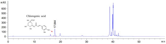 High-performance liquid chromatography chromatogram of the Erigeron breviscapus extract at 325 nm: Chlorogenic acid Retention time = 17.844 min. x-axis: retention time; y-axis: absorbance unit. A Triart C18 column (150 mm × 4.6 mm id, 5 μm) (YMC-PACK®, Japan) was utilized for chromatic separation. The pink line calculates the content by integrating the peaks of chlorogenic acid to get the area value.