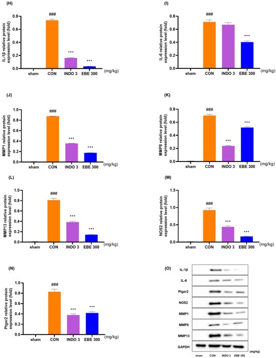 Cytokine changes in the cartilage tissue of the knee joint following EBE treatment. (A–G) Using quantitative real-time PCR, the mRNA expression of IL-1β, IL-6, ptger2, NOS2, MMP-1, MMP-8, and MMP-13 was ascertained. (H–N) Western blot analysis was used to evaluate the protein expression of IL-1β, IL-6, MMP-1, MMP-8, MMP-13, NOS2 and ptger2. (O) Western blot image. ### p < 0.001 vs. sham, * p < 0.05 vs. CON, ** p < 0.01 vs. CON, *** p < 0.001 vs. CON by 1 way ANOVA, Dunnett’s test. CON: control, EBE: Erigeron breviscapus extract, INDO 3: indomethacin 3 mg/kg, MIA: monosodium-iodoacetate.