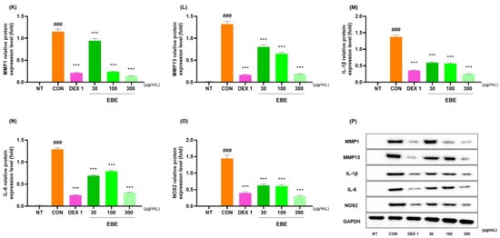 The anti-inflammatory properties of EBE were measured in LPS-treated RAW264.7 cells. At a concentration of 300 µg/mL, EBE showed no signs of possible cytotoxicity in RAW264.7 cells (Figure 7A). EBE reduced LPS-induced NO generation. When comparing the 300 EBE to the control, there was an NO decrease (Figure 7B). EBE reduced the levels of NO, demonstrating strong anti-inflammatory properties. Figure 7C–J illustrates how EBE and DEX 1 reduced the levels of MMP-1, MMP-13, IL-1β, TNF-α, IL-6, COX-2, Ptger2, and NOS2 mRNA expression. The anti-inflammatory properties of EBE in LPS-induced RAW264.7 cells were examined using Western blotting. As seen in Figure 7K–P, EBE administration of LPS-stimulated RAW264.7 cells suppressed the protein production of proinflammatory cytokines, including MMP-1, MMP-13, IL-1β, TNF-α, IL-6, and NOS2. EBE decreased the expression of MMP-1, MMP-13, IL-1β, TNF-α, IL-6, COX-2, Ptger2, and NOS2, as shown by the Western blot images. Notably, EBE showed comparable anti-inflammatory benefits to the positive control against all cytokines.