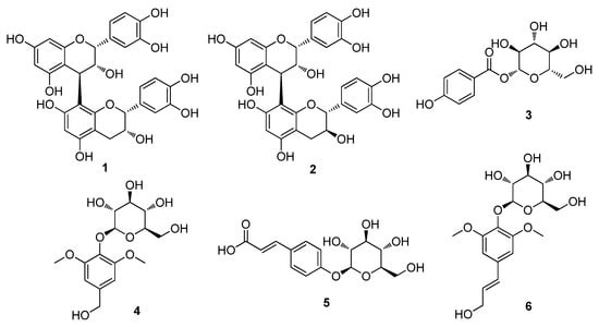 The chemical structures of the isolated compounds 1–6. Procyanidin B2 (1), procyanidin B1 (2), 4-hydroxybenzoic acid β-D-glucosyl ester (3), di-O-methylcrenatin (4), p-coumaric acid glucoside (5) and syringin (6).