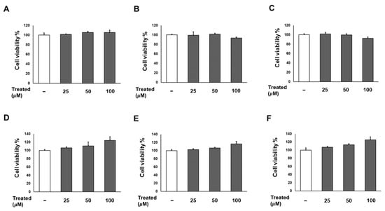 Effects of six compounds (1–6) on preadipocyte 3T3-L1 proliferation. Cells were seeded in 96-well plates at a density of 1 × 104 cells/well for 24 h. Subsequently, cells were treated with compounds 1 (A), 2 (B), 3 (C), 4 (D), 5 (E), and 6 (F) at concentrations of 25, 50, and 100 µM. Cell viability was determined using an Ez-Cytox cell viability assay kit 24 h after treatment. The data are presented as mean ± standard error of mean (SEM), n = 5, analyzed using t-test statistics.