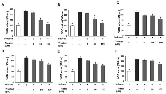 Inhibitory effects of six compounds (1–6) on lipogenesis in 3T3-L1 preadipocytes. Cells were seeded in 48-well plates at a density of 5 × 104 cells/well for 24 h and treated with compounds 1 (A), 2 (B), 3 (C), 4 (D), 5 (E), and 6 (F) (1, 50, and 100 µM) during the induction of 3T3-L1 preadipocyte differentiation. Cell lipid droplets were determined using Oil Red O staining after 7 days of differentiation, and staining efficiency was evaluated by OD value at 500 nm wavelength. Data are presented as mean ± standard error of mean (SEM), n = 4 using t-test statistic. (*) p < 0.05 versus induced only.