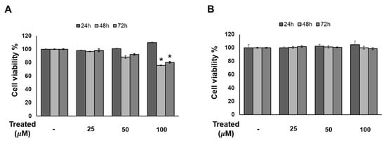 Effect of compound 1 on the proliferation of 3T3-L1 cells. The cells were seeded in 96-well plates at a density of 1 × 104 cells/well for 24 h. Cells were treated with T863 (A) and 1 (B) at concentrations of 25, 50, and 100 µM. Cell viability was determined using an Ez-Cytox cell viability assay kit for 24, 48, and 72 h after treatment. Data are presented as mean ± standard error of mean (SEM), n = 5 using t-test statistic. (*) p < 0.05 versus non-treated at a similar time point.