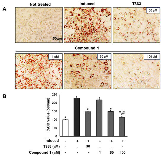 Inhibitory effect of compound 1 on the lipogenesis of preadipocyte 3T3-L1. The cells were seeded in 48-well plates at a density of 5 × 104 cells/well for 24 h and treated with T863 (50 µM) and compound 1 (1, 50, and 100 µM) while inducing 3T3-L1 preadipocyte differentiation. Cell lipid droplets were determined using Oil Red O staining after 7 days of differentiation and treatments (A). Staining efficiency was evaluated by OD value at 500 nm wavelength (B). Data are presented as mean ± standard error of mean (SEM), n = 4 using t-test statistic. (*) p < 0.05 versus induced only group. (#) p < 0.05 versus T863-treated group.