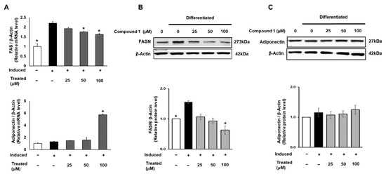 FAS is a crucial enzyme that regulates the synthesis of long-chain fatty acids, which are subsequently stored in fat cells. The accumulation of fatty acids is closely associated with insulin sensitivity in adipocytes [3,10]. Therefore, in this study, we targeted FAS and the insulin-sensitizing marker adiponectin. To assess the expression of FAS and adiponectin, 3T3-L1 cells were treated with compound 1 (0, 25, 50, 100 µM) during lipogenic differentiation for 24 h. The mRNA levels of FAS and adiponectin were examined using qPCR and normalized to β-actin (Figure 7). Compound 1 exhibited a suppressive effect on the mRNA expression of FAS in a dose-dependent manner. At a treatment of 100 µM of compound 1, the mRNA expression of FAS was reduced by 26% compared to that of the induced group. Concurrently, a 6-fold elevation in adiponectin mRNA levels was observed at the same dose of treatment (Figure 7). In addition, to assess the total protein expression of these two genes, we conducted Western blotting for FASN and adiponectin. A similar pattern for compound 1 was observed with the FASN protein level, showing a decline of up to 60% in total FAS expression compared to the induced control (Figure 7). Although there was a significant increase in adiponectin mRNA levels, no change was found in the total protein expression (Figure 7).