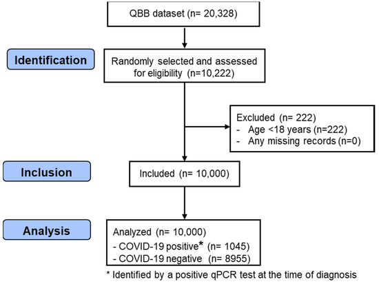 In this study, 10,000 men and women, between the ages of 18 and 79 years, were randomly selected from 20,328 participants recruited by the QBB study. The inclusion criteria were participants > 18 years old and the availability of complete information on the exposure and outcome variables. Participants < 18 years of age (n = 222) and participants with missing data on COVID-19 and the exposure variables (n = 0) were excluded. Those with complete information on the exposure and outcome variables were eligible for inclusion in this study. Figure 1 shows the process of the selection of the participants from the QBB dataset.