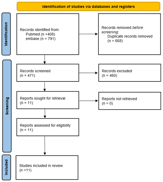 We retrieved 408 articles from PubMed and 791 articles from Embase. After duplicates removal and exclusion criteria, 11 RCTs remained eligible (see the flow chart in Figure 1) [9,10,11,13,14,15,16,17,18,19,20].