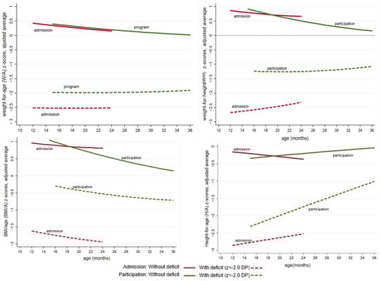 Adjusted average curves of z-scores (W/A, W/H, BMI/A, H/A) according to the nutritional deficit and exposure to the programme (admission and participation; n = 7752), Manaus, 2017–2020.