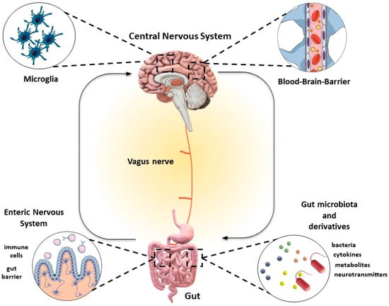 The main neuronal communication pathway involving the autonomic nervous system runs via the vagus nerve, a vital conduit linking the intestines and the ENS with the brainstem. This pathway facilitates the transmission of signals associated with gastrointestinal function to the CNS. The sensory fibers of the vagus nerve, equipped with specialized receptors in the intestinal lining, can detect signals triggered or produced by the microbiota. This pathway can detect the presence of specific metabolites, microbial by-products, and neurotransmitters from the ENS, cytokines, or gut hormones [91]. For example, the vagus nerve possesses transmembrane molecular sensors, including GPCRs [92], such as GPR41 and GPR43, activated by SCFAs. The production of neurotransmitters, such as serotonin, GABA, and glutamate, is influenced by the binding of microbial metabolites to specific receptors in vagal sensory neurons. Neurotransmitters produced in response to microbial signals can influence neural signaling within the ENS and the gut. When the gut microbiota generates metabolites or produces signaling molecules, the sensory fibers of the vagus nerve can detect these signals and transmit them into the brain, conveying information about the gut’s status and microbial activity [91].