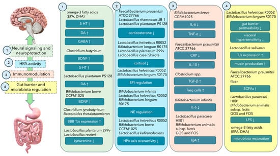 Studies have also identified the positive effects of psychobiotics using distinct strains of probiotic bacteria. In a study by Liu et al. (2016), naïve adult mice and mice under stress in early life were administered 1 × 109 CFU of Lactobacillus plantarum PS128 [160]. An open field test showed that the administration of Lactobacillus plantarum PS128 increased psychomotor activity in both stressed and naïve adult mice in early life. In a cross maze test, Lactobacillus plantarum PS128 helped reduce anxiety behaviors in naïve adult mice. These activities were not observed in stressed mice in early life. The study showed a noticeable effect on immune system parameters. The supply of psychobiotics used in the study reduced serum corticosterone levels in both the primary and stressed states in the mice that were stressed early in life. However, no effect was observed in naïve mice. The levels of inflammatory cytokines also decreased, while serum anti-inflammatory cytokines increased in the mice stressed early in life. The dopamine levels in the prefrontal cortex were elevated in both treated groups, while the serotonin levels were elevated only in the naïve adult mice [160]. Another study confirming the beneficial effects of psychobiotics on animal models of depression conducted by Tian et al. [161] has identified the psychobiotic potential of Bifidobacterium breve CCFM1025. In the experiment, C57BL/6J mice were administered 0.1 mL/10 g body weight of Bifidobacterium breve CCFM1025 suspension at a concentration of 1 × 109 CFU/mL daily for 5 weeks. The study showed that treatment with Bifidobacterium breve CCFM1025 helped reduce anxiety and depressive behaviors. Inflammation caused by the HPA axis reactivity was alleviated, resulting in reduced glucose receptor expression and hypocamic receptor expression. Reduced levels of IL-6 and circulating TNF-α were also determined. In addition, an upregulation of BDNF was noted. Supplementation with the aforementioned psychobiotic restored the balance of the intestinal microflora, particularly in terms of the ratio of Actinobacteria to Proteobacteria.