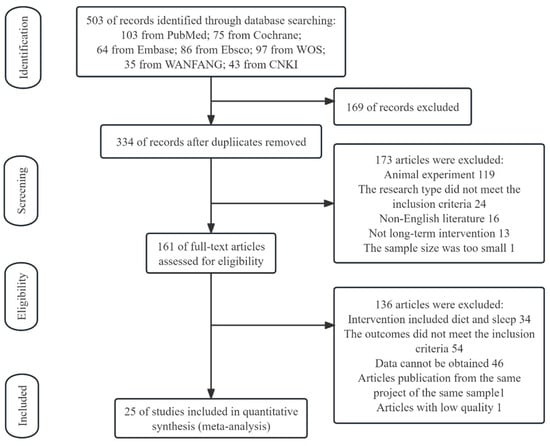 At the end of the selection process, 503 articles were extracted, of which n = 97 were from Web of Science, n = 103 were from PubMed, n = 86 were from Ebsco, n = 64 were from Embase, n = 75 were from Cochrane Library, 35 were from WANFANG, and 43 were from CNKI. Each title and abstract were screened for relevance, removing review articles, comments, animal model subjects, conference abstracts, case reports, practical guidelines, books, and book chapters (n = 334). Thereafter, the screening was based on the assessment of the full text of the remaining 161 articles to verify their eligibility. Lastly, 25 research articles specifically focusing on the effect of physical activity or exercise on GM in healthy and unhealthy participants were included (Figure 1).